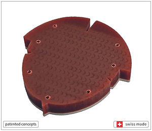 The sole element is made of 52 steel and is only 5 mm thick. The element in contact with the ground is covered with 15 mm of polyurethane with a Shore hardness of 70. The two parts are delivered separately. The farrier assembles them by screwing them according to the horizontal rotation of the horny box. That is, the sole element must correspond to the cornea, and the element in contact with the ground must correspond to the position of the foot bone.