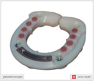 The concept of the WTS Revolution iron consists of three parts. The aluminum floor element is glued to the support edge of the wall. It is designed so as to allow the horizontal mechanism of the hoof (dilation and contraction of the horny box) and the vertical mechanism of the hoof (vertical displacement of the wall and glomes). There are four M6 diameter screw threads, two at the toe and two at the heel. Training iron in PE material lightweight is therefore fixed to the floor element using 4 screws. The Training Iron offers the following features: flexibility, A 3 degree angle, fork support, steel insert for better abrasion resistance, anti-slip protection in PUR crampons with studs. The WTS Revolution iron and the horn box form a single unit. The horse is like barefoot, but with more traction and protection. The Training Shoe iron can be unscrewed at any time and exchanged for a Competition Shoe iron. The latter is made of aluminum with grooves and a steel insert for better traction.