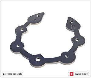 The concept of the WTS Revolution iron consists of three parts. The aluminum floor element is glued to the support edge of the wall. It is designed so as to allow the horizontal mechanism of the hoof (dilation and contraction of the horny box) and the vertical mechanism of the hoof (vertical displacement of the wall and glomes). There are four M6 diameter screw threads, two at the toe and two at the heel. Training iron in PE material lightweight is therefore fixed to the floor element using 4 screws. The Training Iron offers the following features: flexibility, A 3 degree angle, fork support, steel insert for better abrasion resistance, anti-slip protection in PUR crampons with studs. The WTS Revolution iron and the horn box form a single unit. The horse is like barefoot, but with more traction and protection. The Training Shoe iron can be unscrewed at any time and exchanged for a Competition Shoe iron. The latter is made of aluminum with grooves and a steel insert for better traction.