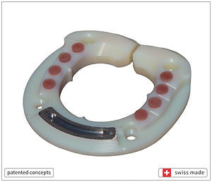 The concept of the WTS Revolution iron consists of three parts. The aluminum floor element is glued to the support edge of the wall. It is designed so as to allow the horizontal mechanism of the hoof (dilation and contraction of the horny box) and the vertical mechanism of the hoof (vertical displacement of the wall and glomes). There are four M6 diameter screw threads, two at the toe and two at the heel. Training iron in PE material lightweight is therefore fixed to the floor element using 4 screws. The Training Iron offers the following features: flexibility, A 3 degree angle, fork support, steel insert for better abrasion resistance, anti-slip protection in PUR crampons with studs. The WTS Revolution iron and the horn box form a single unit. The horse is like barefoot, but with more traction and protection. The Training Shoe iron can be unscrewed at any time and exchanged for a Competition Shoe iron. The latter is made of aluminum with grooves and a steel insert for better traction.